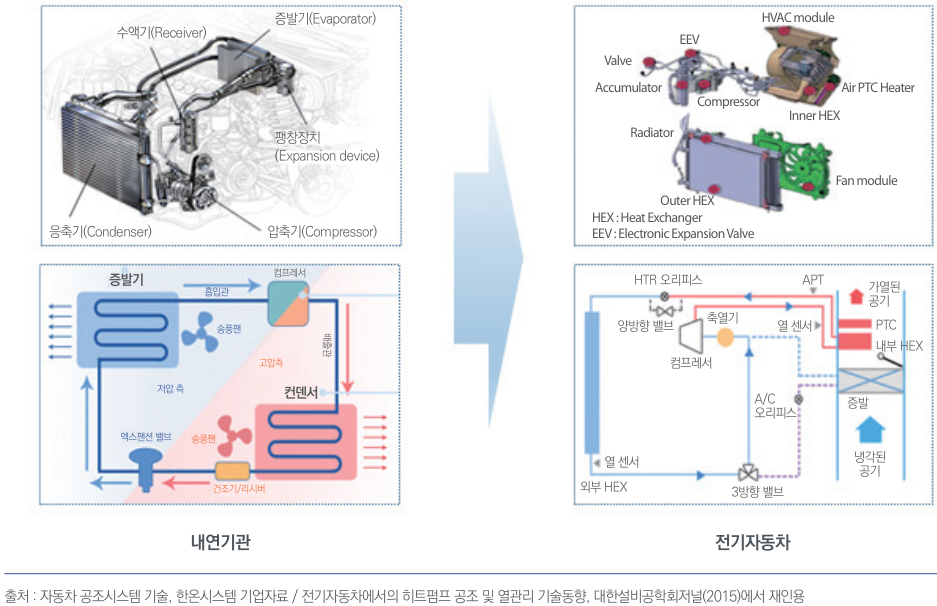 전기차 열관리시스템은 차량 내 냉난방뿐 아니라 모터·인버터 등 구동장치 및 배터리 장치의 온도를 통합해 관리해야합니다. 냉각시스템도 엔진 쿨링에서 전장부품·배터리 쿨링으로 확장되고 냉각수 펌프 및 냉매 압축기도 기계식에서 전동식으로 변경됩니다.