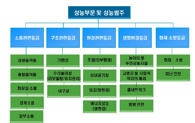 성능항목은 주택법에 규정된 5가지 분야로 구분하고 18개 성능분야로 구성되어 있다.